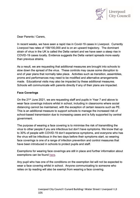 IMPORTANT PARENT/CARER UPDATE! An important safety update from @lpoolcouncil @LiverpoolPH about rising COVID rates! We will write to all parents/carers next week about our plans to safely manage getting to the summer holidays. Year 6 don’t worry, prom is still going ahead! 😅