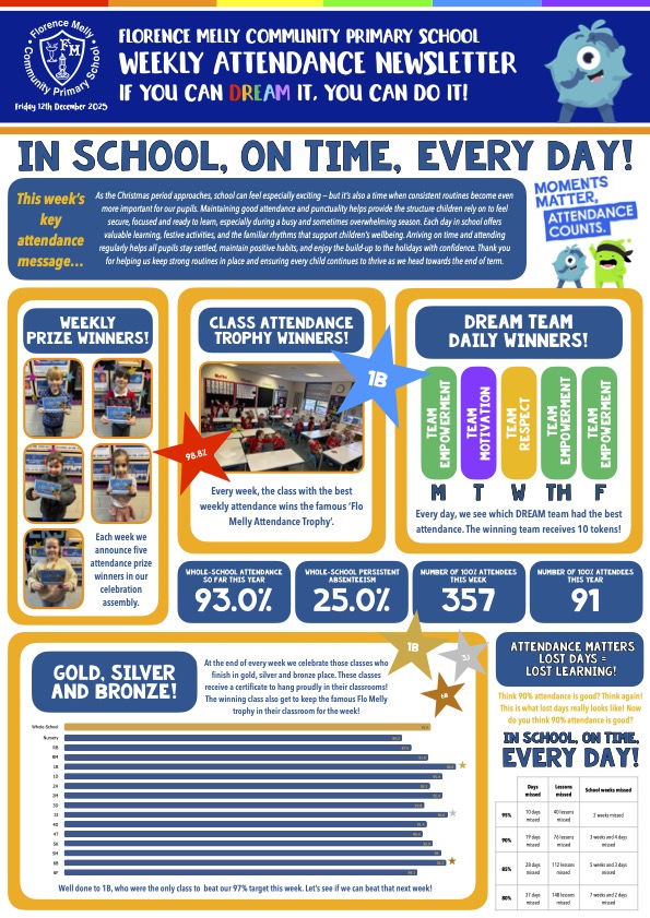 Florence Melly Primary School is dedicated to ensuring every pupil attends school, arriving on time, every day. Regular attendance is crucial for academic success, social development, and overall well-being. Below, you can access our attendance strategy, guided by the ‘Working Together to Improve School Attendance’ document, 2024 and recent internal and external reviews of our practice, to outline our comprehensive approach to promoting, monitoring, and improving school attendance.