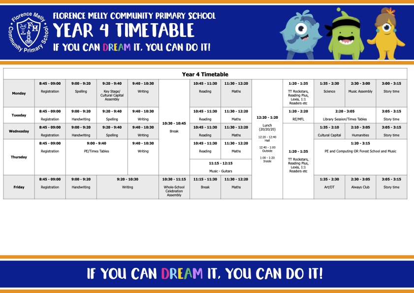 Please click on the image below to access the Year 4 timetable for this year. This is printable and would look perfect on your fridge!