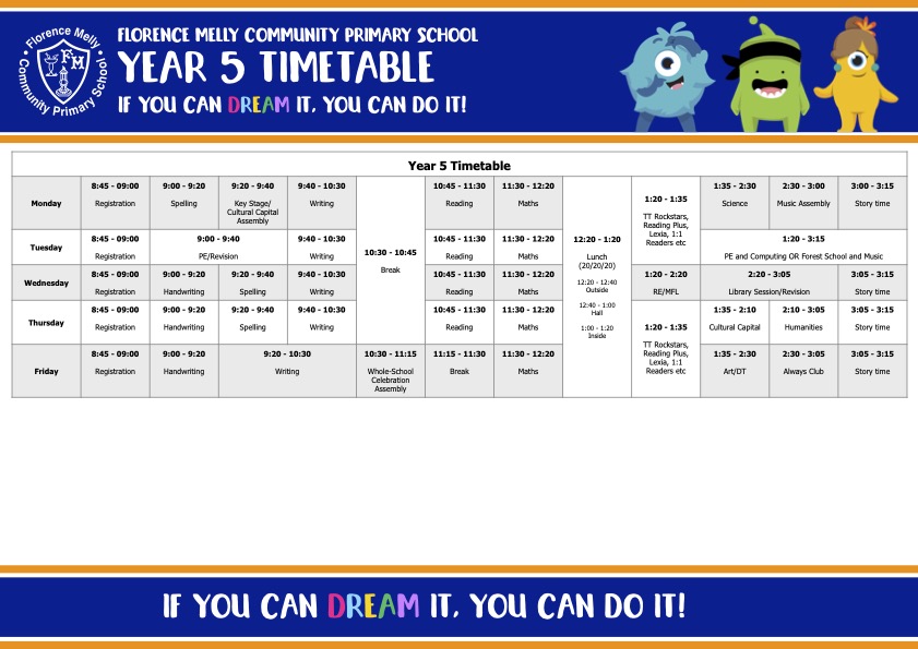 Please click on the image below to access the Year 5 timetable for this year. This is printable and would look perfect on your fridge!