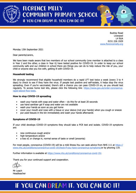 We have been made aware that two members of our school community (one attached to a class in Year 2 and the other, a class in Year 6) have tested positive for COVID-19. In order to keep our school community safe and our children in school there are things you can do to help reduce the risk of you, your child or anyone else you live with, getting ill with COVID-19. Please see the letter attached for further details.