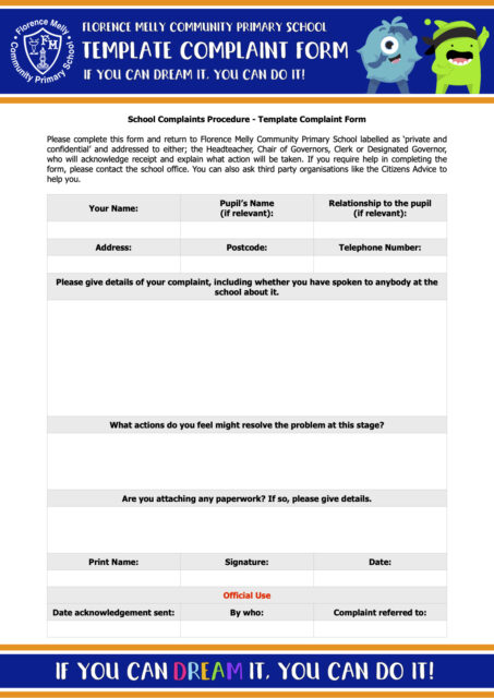To access our school’s complaints procedure, please click this link: School Complaints Procedure. Should you require a paper copy, please contact the school and this will be provided, free of charge.