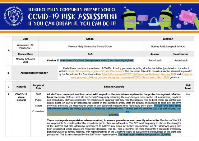 Please take a few minutes to have a look through our most up to date COVID-19 risk assessment. These are the measures we put in place to keep our whole school community safe. If you have any questions about the measures set out in this document or have any suggestions as to how we can make our school even safer, please do not hesitate to contact Mr Leach, our Headteacher and COVID-19 Lead. Further COVID-19 related news and information can be found on our COVID specific webpage: http://dev.florencemelly.mgl2020.claritycreation.com/parents/covid-19-updates/. Thank you. Take care and stay safe.