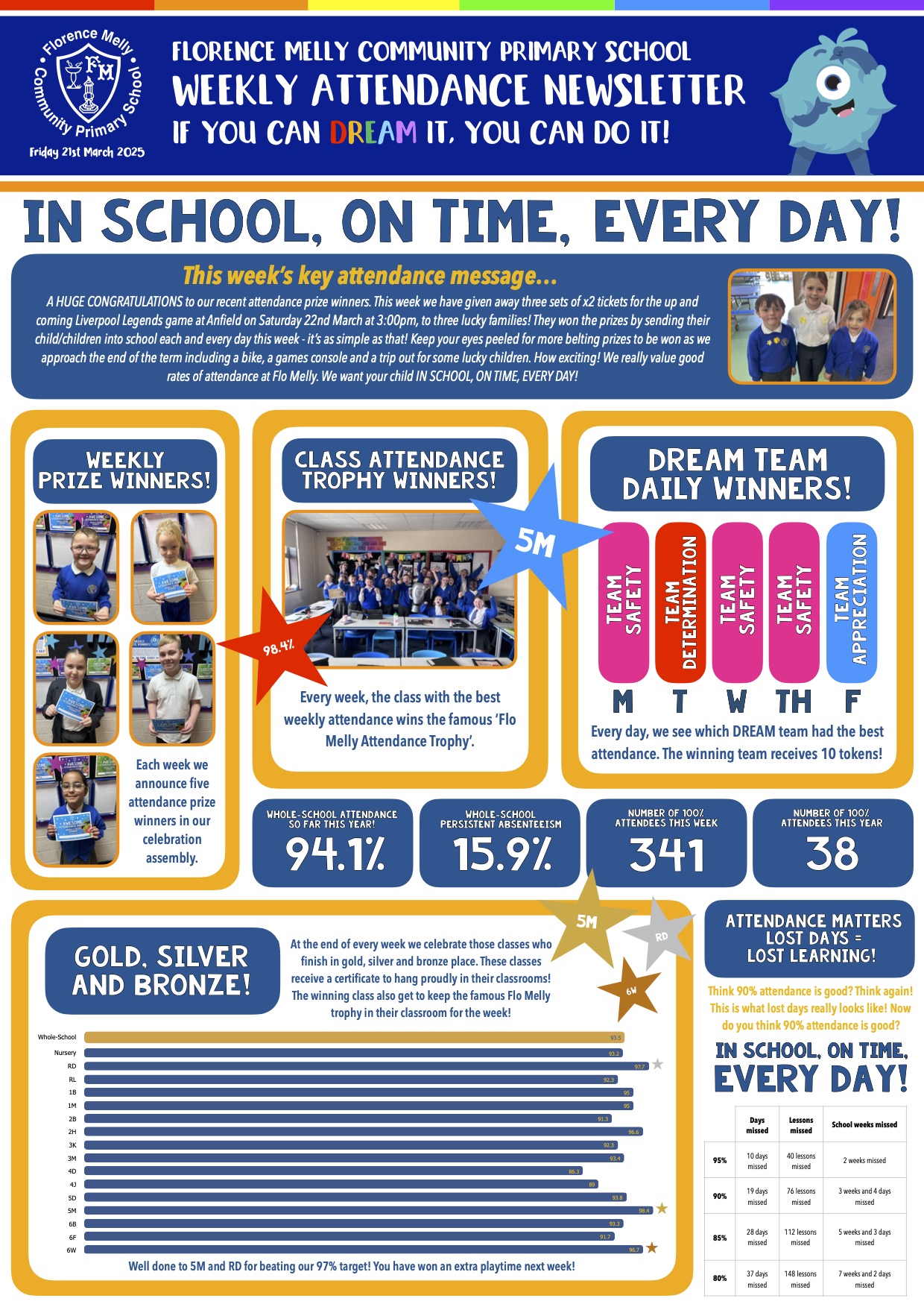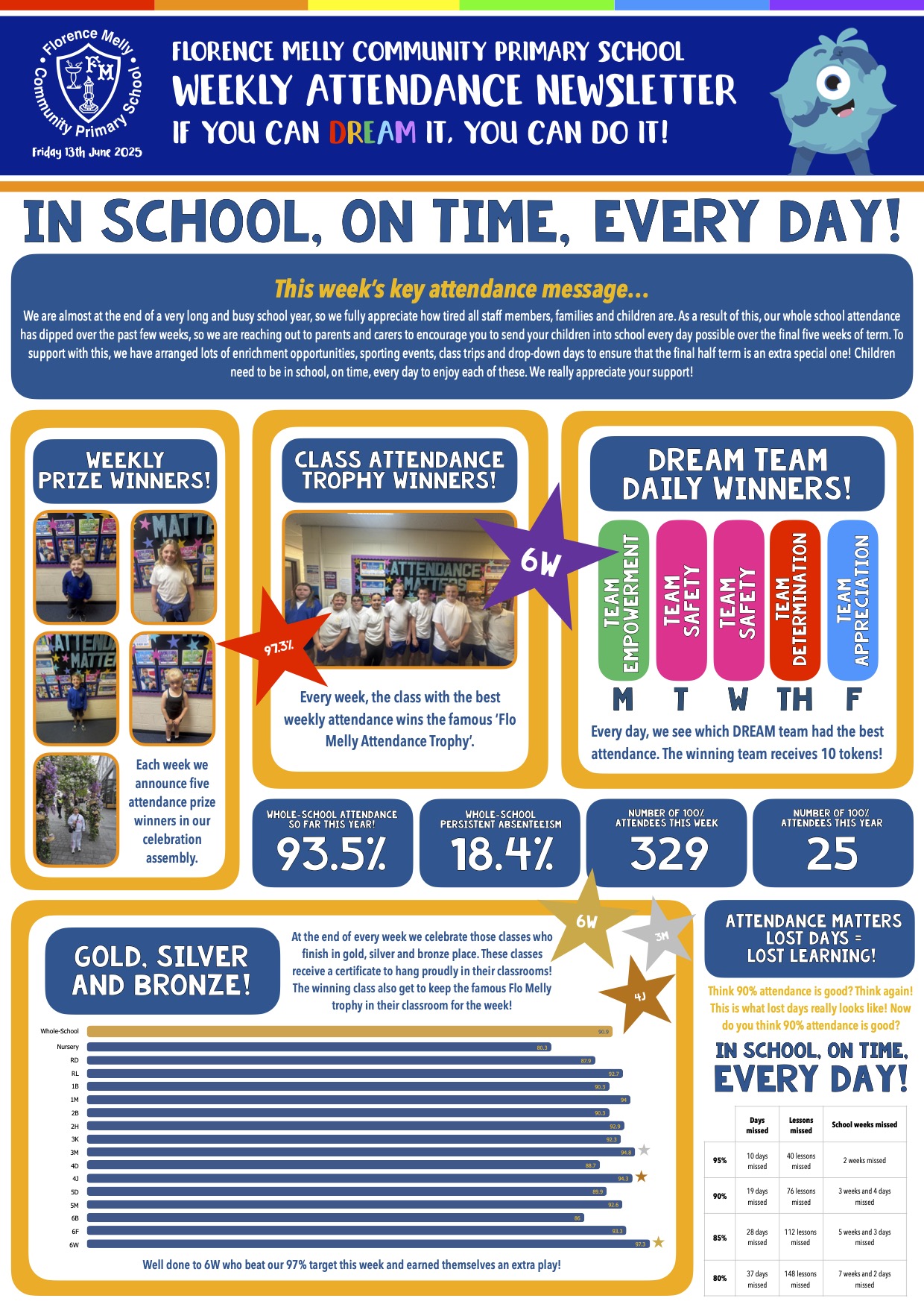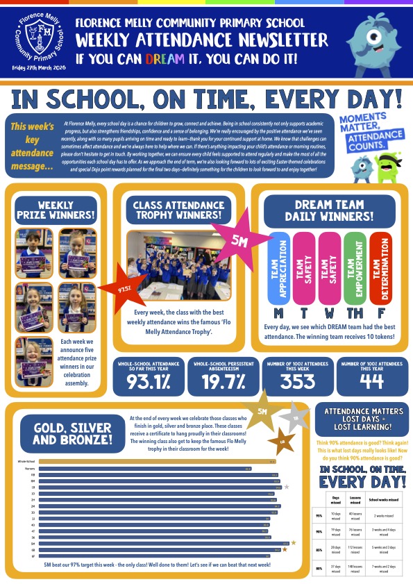 Florence Melly Primary School is dedicated to ensuring every pupil attends school, arriving on time, every day. Regular attendance is crucial for academic success, social development, and overall well-being. Below, you can access our attendance strategy, guided by the ‘Working Together to Improve School Attendance’ document, 2024 and recent internal and external reviews of our practice, to outline our comprehensive approach to promoting, monitoring, and improving school attendance.