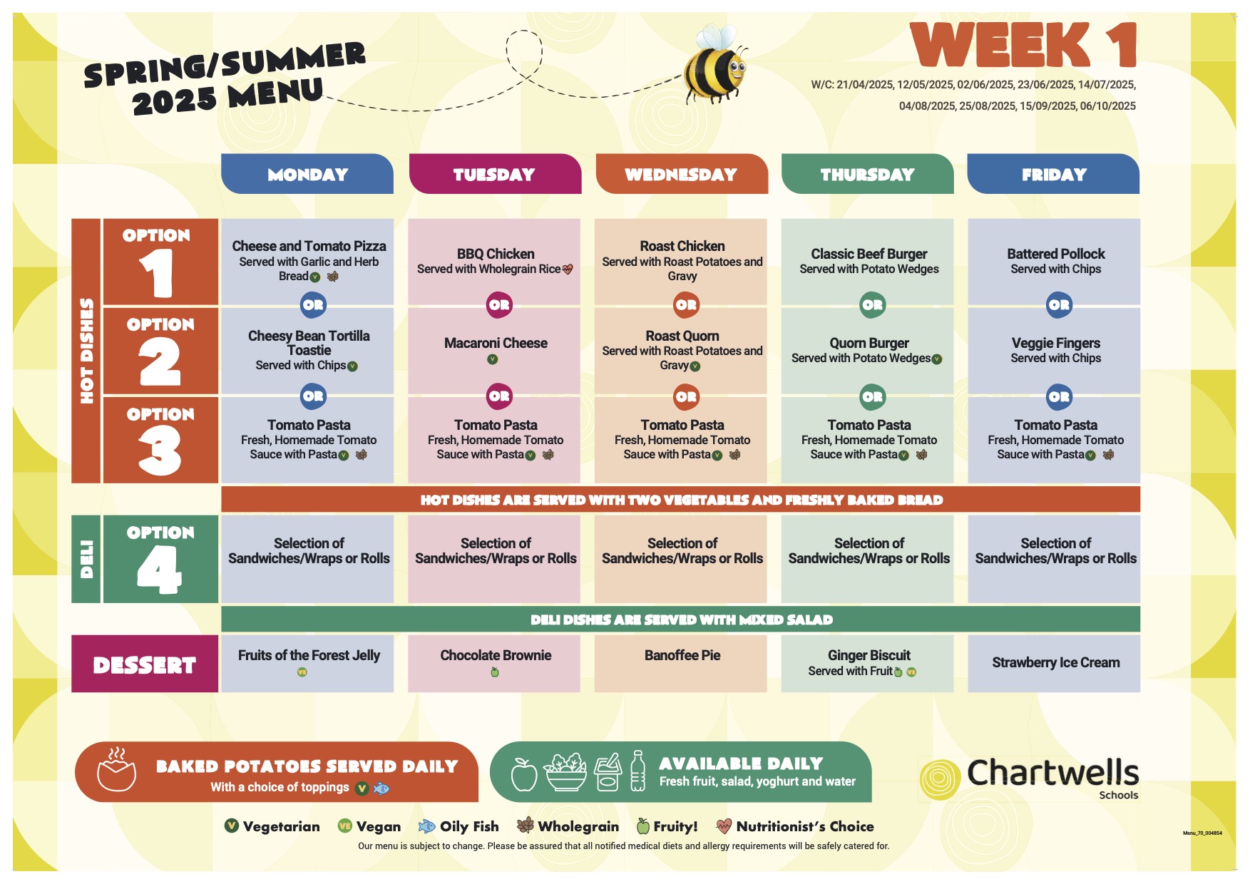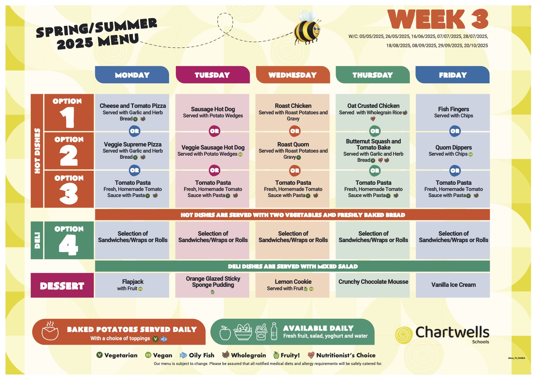 The hot-dinner offer from Chartwells changes regularly and runs on a three-week cycle. For this term’s menu, please click the link below: